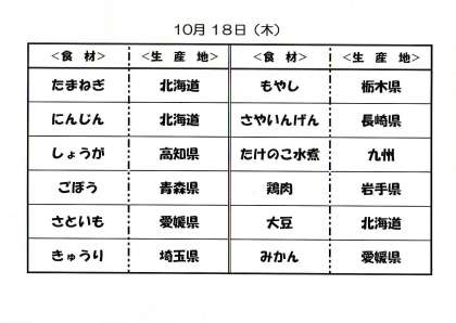 18日(木)の給食は、「ごはん、豆入り筑前煮、もやしとわかめのあえ物、みかん、牛乳」です。主な食材の産地は以下の通りです。