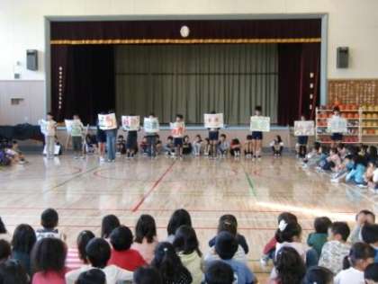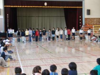 毎週金曜日の朝は、全校集会を開いています。そのときによって、歌を歌ったり、交流のゲームをしたり、様々な形で子どもたちの自主的な活動の場面になっています。10月19日の朝は、委員会活動の後期委員長の紹介と活動内容の紹介がありました。
