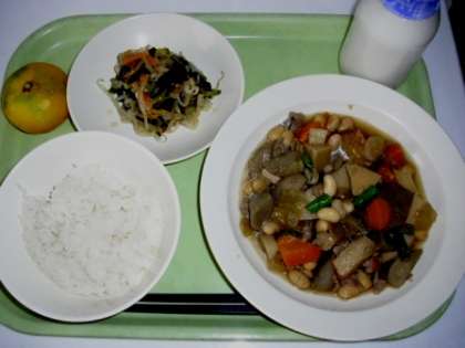 18日(木)の主菜は、根菜、鶏肉、大豆、さつま揚げ、いんげんなど12種類もの具材の入った「豆入り筑前煮」でした。「煮物はたくさん作った方が美味しい」といわれるように、給食の煮物はたくさんの食材のうまみがでて、とても味わい深い煮物に仕上がります。