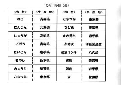 19日(金)の給食は、「磯おこわ、飛魚のつみれ汁、糸寒天と野菜のあえもの、牛乳」です。主な食材の産地は以下の通りです。