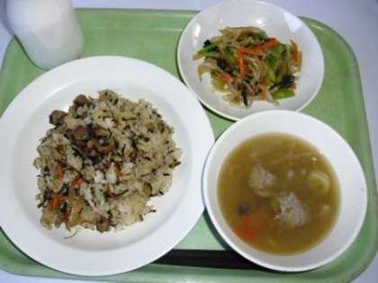 19日(金)の給食では、海の食材をたくさん使いました。刻み昆布やひじきが入った「磯おこわ」、八丈島産の飛魚のすり身を使った「飛魚のつみれ汁」、伊豆諸島産の天草から作られた糸寒天を使った「糸寒天と野菜のあえ物」、「牛乳」でした。全体的に残りは少なく、よく食べていました。