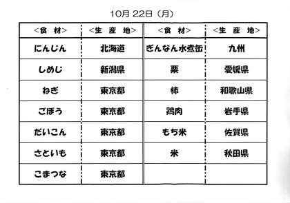 22日(月)の給食は「吹き寄せごはん、世田谷根菜汁、柿、牛乳」です。「世田谷根菜汁」には、世田谷産の長ネギ、里芋、大根、ごぼう、小松菜を使います。本日の主な食材の産地は以下の通りです。