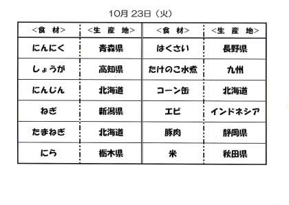 10月22日(月)の給食と23日(火)給食食材の産地について
