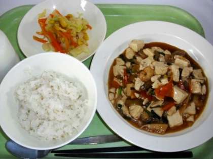 23日(火)の主菜は、四川豆腐でした。マーボー豆腐との違いは、豚ひき肉ではなく豚肉の小間切れを使い、エビ、たけのこ、たまねぎ、ザーサイなども入った具だくさんなところです。いつもの給食のマーボー豆腐より少し辛めの仕上がりでしたが、子どもたちはよく食べていました。