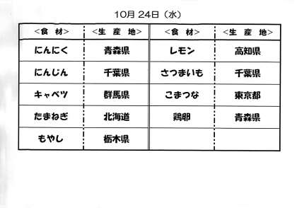 10月23日(火)の給食と24日(水)給食食材の産地について
