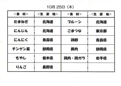 10月24日(水)の給食と25日(木)給食食材の産地について