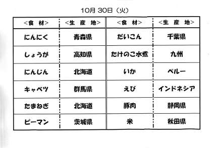 29日(月)の給食と30日(火)給食食材の産地について