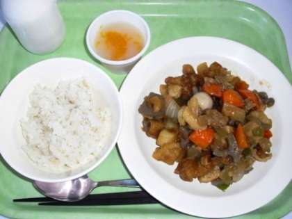 1日(木)の主菜は、秋野菜であるれんこんを入れた「鶏肉と野菜の酢豚風」でした。いろいろな野菜とともに、子どもたちの大好きな鶏肉のから揚げが入っているので、児童に好まれる料理かと思いましたが、野菜が苦手な児童や甘酢あんかけの味が苦手な児童もいたようで、残りは少し多めでした。