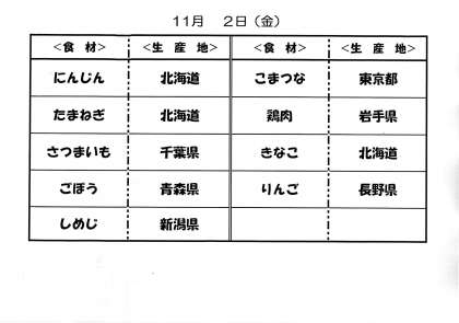 11月1日(木)の給食と2日(金)給食食材の産地について