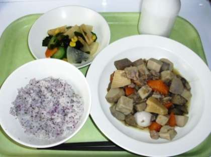 5日(月)は世田谷産の野菜をたっぷり使ったメニューでした。にんじん、ごぼう、さといもを煮物に、だいこんとにんじんをあえものに使いました。子どもたちに実物を見せられなかったのが残念でしたが、大根とごぼうは見たこともないぐらい立派なものが納品されました。