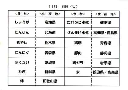 11月5日(月)の給食と6日(火)給食食材の産地について
