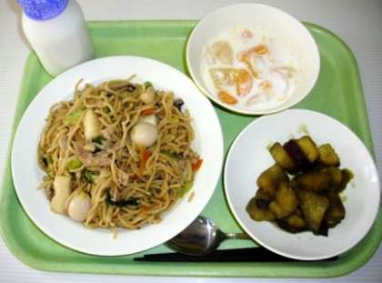 7日(水)は具だくさんの「五目焼きそば」、「さつま芋の含め煮」、「フルーツヨーグルト」、「牛乳」というメニューでした。今日は特別時程の4時間授業ということで、いつもより15分ほど給食が早く、さらに五目焼きそばは手間がかかるメニューでもあり、給食室は大忙しでした。