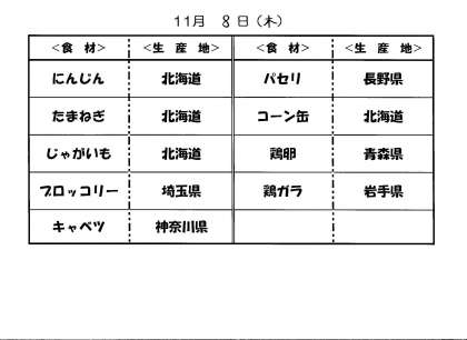 11月7日(水)の給食と8日(木)の給食食材の産地について