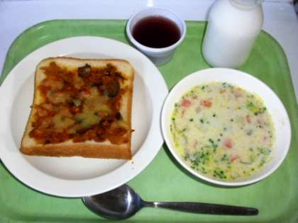 12日(月)の献立「ツナピザトースト、コーンポテトスープ、ぶどうゼリー、牛乳」は、どれも子どもたちが食べやすいメニューだったようでした。特に、100%グレープジュースを使った手作りぶどうゼリーは、各クラス、お代わりジャンケンが熱く繰り広げられていました。