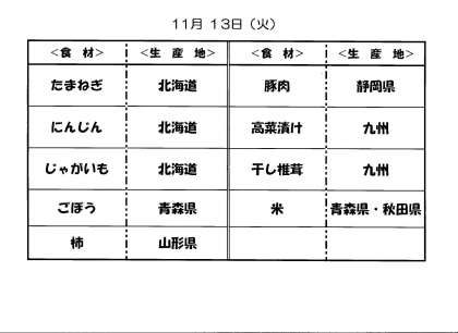 11月12日(月)の給食と13日(火)給食食材の産地について