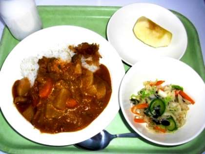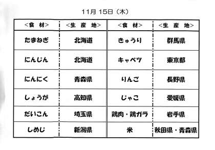 15日(木)の給食は「大根カレーライス、福神漬け、わかめとじゃこのサラダ、りんご、牛乳」でした。大根カレーは、本年度の世田谷食育メニューの一つとして、世田谷保健所から出されたパンフレットに掲載されたメニューです。「カレーに大根?」と思うかもしれませんが、作ってみると、とても美味しくできました。給食時間中に子どもたちの様子を見にいくと、「とても美味しい!」とモリモリ食べていました。