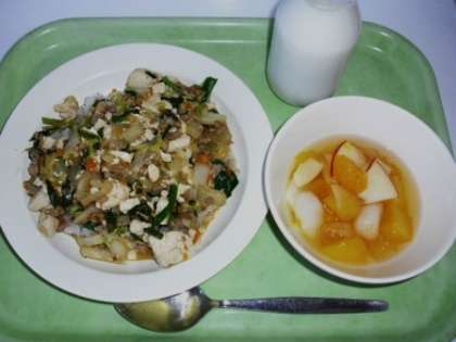 21日(水)の給食では、旬の白菜をたっぷり使ったマーボー丼、フルーツ白玉、牛乳でした。本校は白玉も手作りなので、1年生でも食べやすいように、小さくうすく作りました。また、缶詰のフルーツだけでなく、今日は旬のリンゴを皮ごとイチョウ切りにして加えました。見た目にもリンゴの赤が鮮やかで、味もリンゴの酸味が加わって、いつも以上においしくできました。
