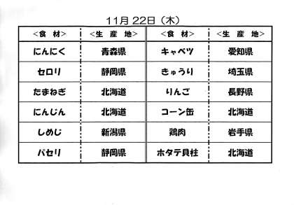 11月21日(水)の給食と22日(木)給食食材の産地について