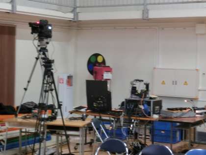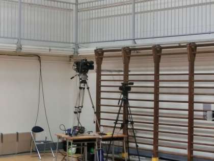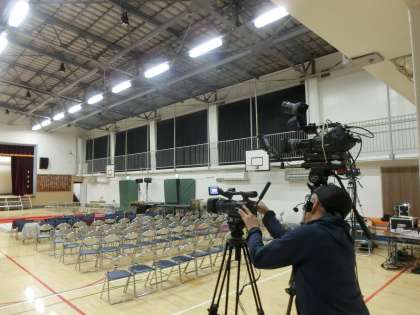 本日は児童鑑賞日です。プロのカメラマンが劇や演奏を撮影します。写真は、昨日の放課後から体育館の後ろにセッティングされた機材です。今日も子どもたちが一生懸命頑張ります!