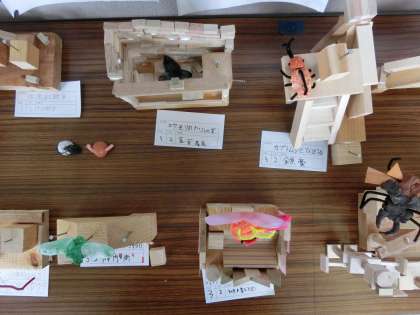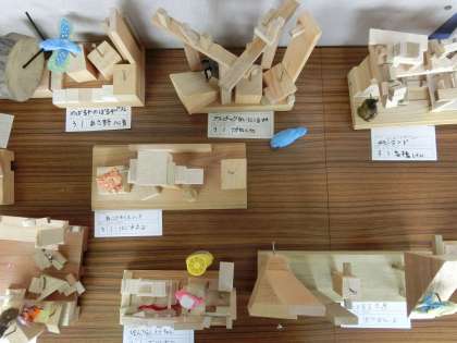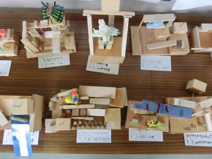 教室の外の廊下のところに、図工で作った木工作品が展示されています。どの作品も、とても良い仕上がりになっています。