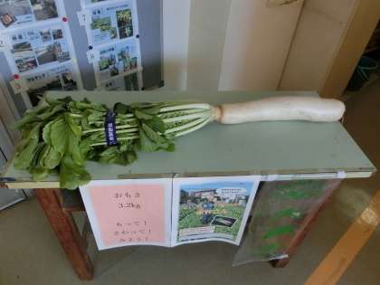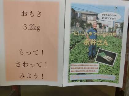今日の給食のメニューには、せたがやそだちの大蔵大根が使われています。給食室の前に、立派な大根が展示されていました。実際に持って重さを確かめていた子どもたちもいました。