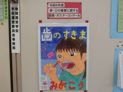 本校に在籍している4年生児童の作品が、玉川歯科医師会図画ポスター展最優秀賞、東京都学校歯科医会主催の令和6年度歯・口の健康に関する図画・ポスターコンクール高学年の部で、東京都2位入賞作品に選ばれました。校内でも表彰され、現在校長室に絵が飾られています。