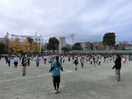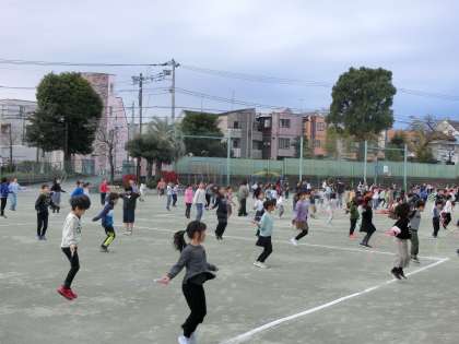 本日の体育朝会は、1〜3年生の縄跳びでした。朝からとても寒かったのですが、しっかり準備運動をして体を温め、元気いっぱいにいろいろな跳び方にチャレンジしていました。