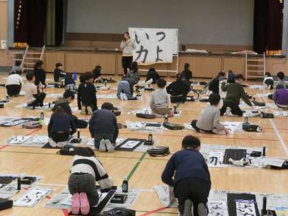 今日は3年生が体育館で書初めです。3年生にとっては、毛筆書写で書初め会をするのは初めてとなります。担任の先生方の他、学校支援員の方々にも見守られながら、先生の指示をよく聞き、お手本をよく見てしっかりと書初めを行っていました。