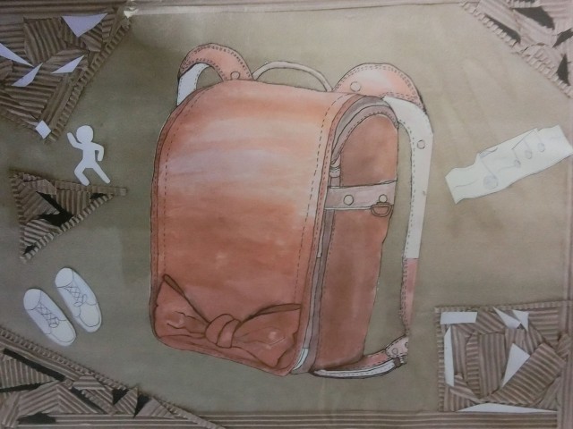 1階の職員室前に、6年生が図工の時間に描いたランドセルが飾られています。