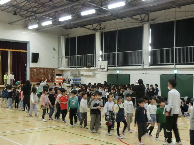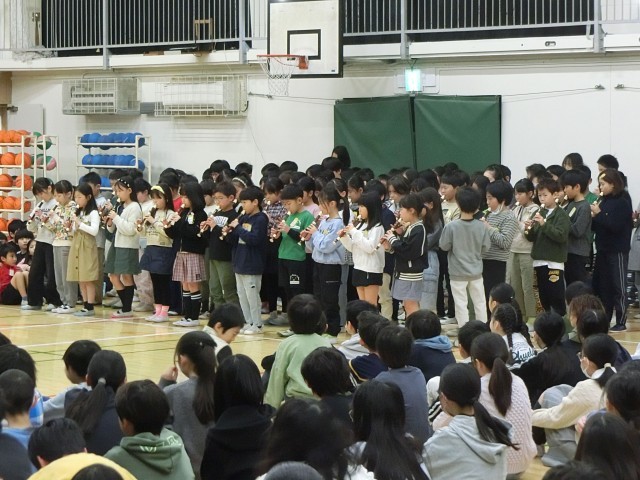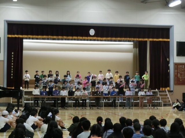 今日の音楽朝会は、1年生の合奏と3年生のリコーダーの発表がありました。各学年、とてもよい感想を述べていました。帰りも、3年生の「パフ」のリコーダーの音に合わせて教室へ戻りました。