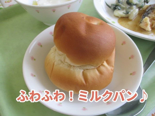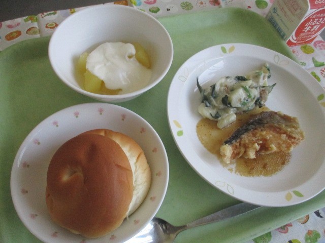 【献立】*ミルクパン *魚のバーベキューソース *じゃがいものクリーム煮 *りんごヨーグルト *牛乳