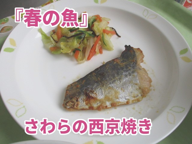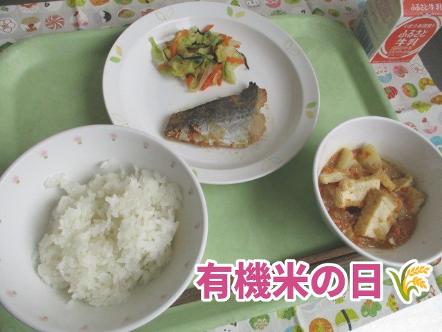 【献立】*有機米 *さわらの西京焼き *野菜の塩昆布かけ *生揚げそぼろあんんかけ *牛乳