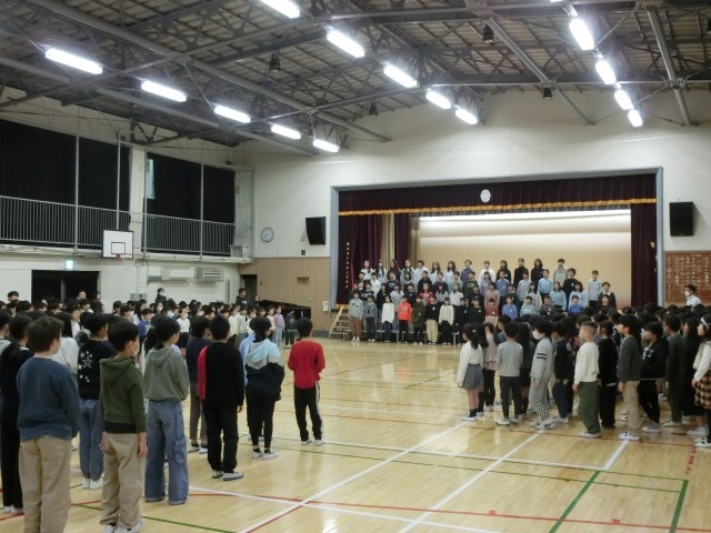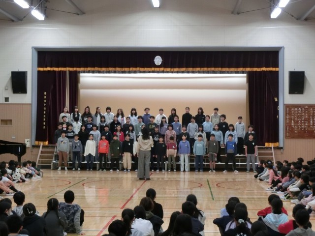 6年生は、全校児童に向けて「旅立ちの日に」を合唱し、美しいハーモニーを体育館に響かせていました。その後、全校で「ビリーブ」を歌いました。令和6年度の全校児童で歌う最後の合唱でした。
