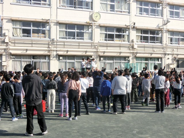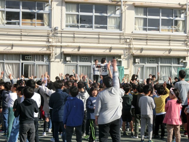 本日の児童集会は、東玉川小学校にまつわる〇×クイズを校庭で行いました。青空の下、簡単なようでちょっと難しいお題を考えていました。