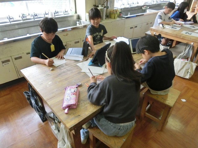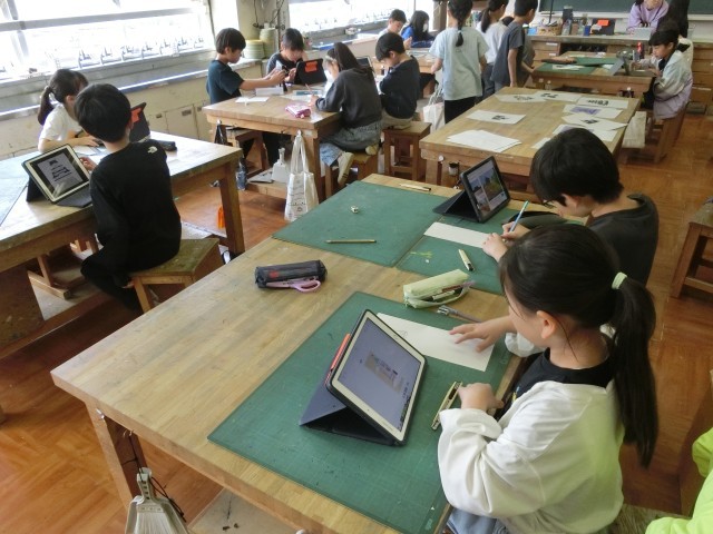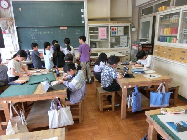 4年生が、図工で「夢の城」を考えていました。タブレットなどで調べた「お城の形」から、自分たちで想像を膨らませながら学習に取り組んでいました。どの子も集中していて、とても楽しそうです。