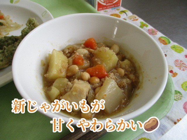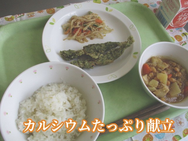 🦴献立🦴 麦ごはん・ししゃもの磯辺揚げ・ごま酢かけ・新じゃがいものそぼろ煮・牛乳