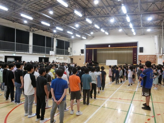 今日の朝は音楽朝会です。1年生は初めて朝会に参加しました。全員で校歌を歌いました。音楽の先生から、歌う時のポイントなどが伝えられ、全員でのびやかに歌うことができました。