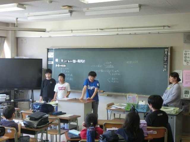 今日は、本年度最初のクラブ活動がありました。早速組織づくりを行い、部長等を決めた後、クラブの目当てなどを話し合ったり、決めたりしていました。運動系のクラブは、すぐに校庭に出て練習する姿も見られました。
