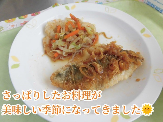 🐟献立🐟 麦ごはん・あじの南蛮あげ・もやしのおかかあえ・豆腐とわかめのみそ汁・牛乳