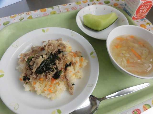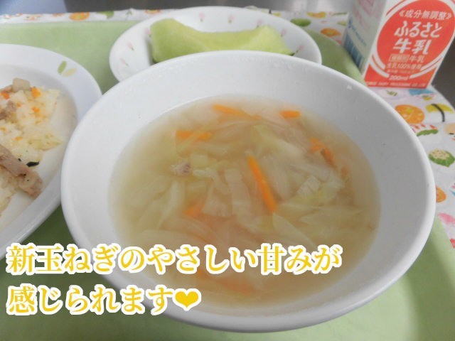 🍈献立🍈 焼肉ガーリックライス・新玉ねぎとろとろスープ・くだもの(メロン)・牛乳