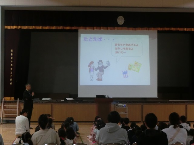 2時間目は1・2年生、3時間目は3・4年生を対象に、セーフティ教室が行われました。玉川警察の方にお越しいただき、実際にこんなことがあったら・・というシミュレーションなどを交え、安全について学習しました。