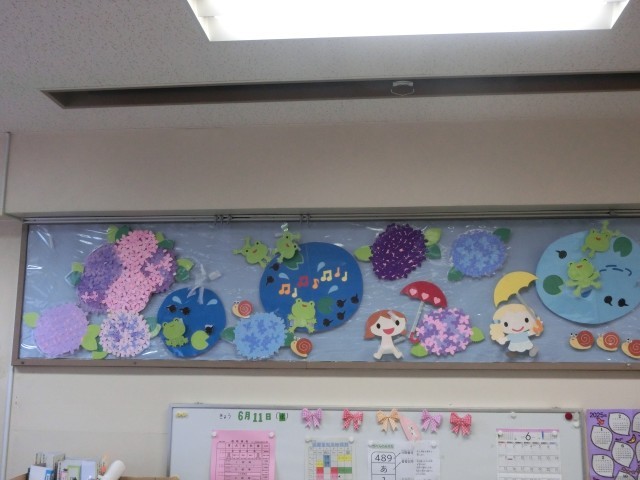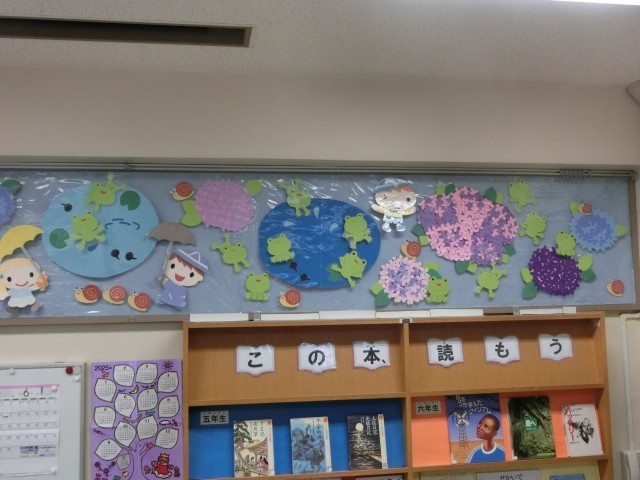 図書室の装飾が「梅雨」に変更されています。毎回、本校の読書支援部の方々が、丁寧に飾り付けをしてくれています。季節を感じるかわいらしい飾りつけは、見ていてとても癒されます。