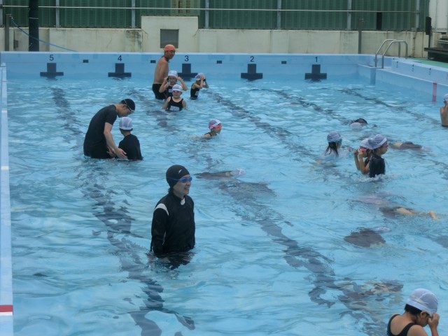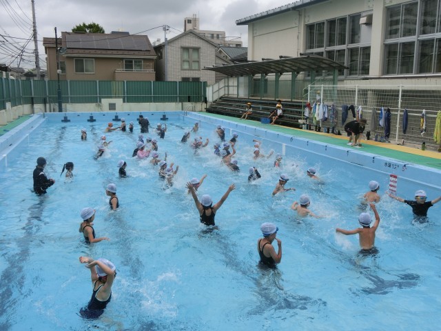 今日は1年生の水泳の日です。夏休みと9月の水泳がなくなり、学校で水泳の学習ができるのは1学期までとなったので、特に普段水に慣れていない子どもたちにとっては貴重な機会です。校長先生をはじめ、先生方がたくさん見守ったり、個別指導をしたりして、安全第一に学習が行われています。