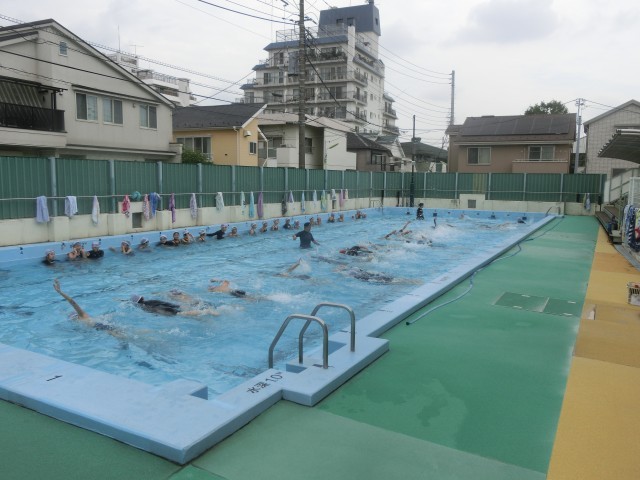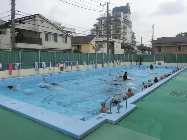 今日の朝は小雨が降っていましたが、気温と水温が適正だったため、水泳指導が行われました。学校では、区が定めた気温+水温の温度の合計数値によって実施の可否が決まります。暑すぎても寒すぎても実施不可になる場合もあるのですが、本年度は天候にも恵まれ、適温の範囲内で水泳の実施ができています。