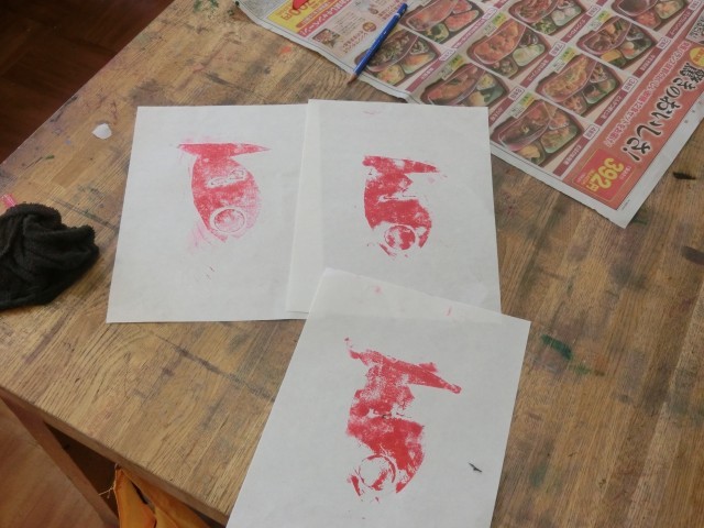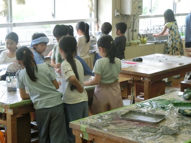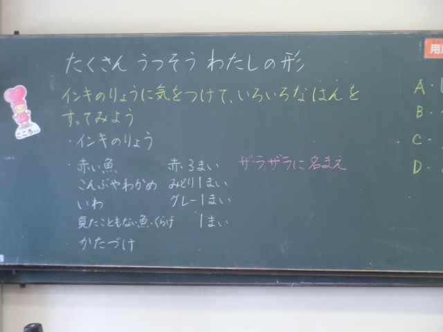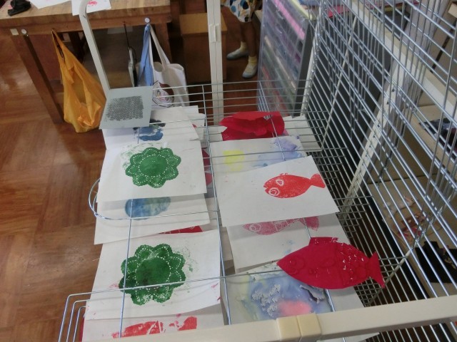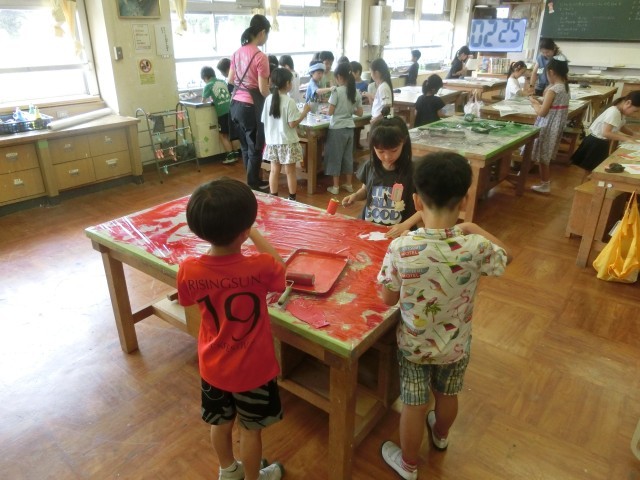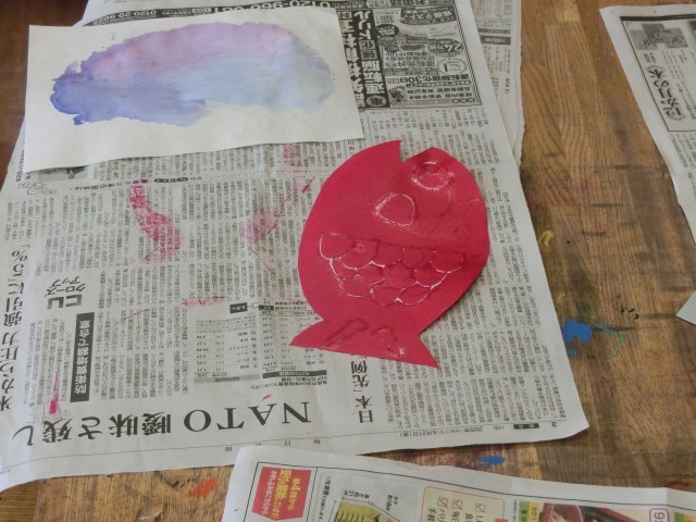 2年生が、何やら楽しそうに版を楽しんでいます・・見たところ魚の形をしていたので、何を作っていたのかを聞いてみると、国語で学習している「スイミー」の世界を版にしているようでした。緑は海草・・?どんな出来栄えになるのか、楽しみです。