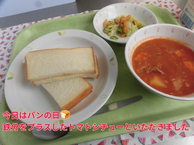 🍅献立🍅 りんごジャムサンド・パリパリサラダ・トマトシチュー・牛乳🐄