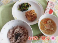 🌸献立🌸 赤飯・鶏肉のからあげ・こまつなの磯あえ・すまし汁・りんごジュース🍎今年...
