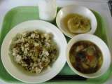 3学期の給食が始まりました。 今日のメニューは「豚肉とごぼうのごはん、なめこと麩...