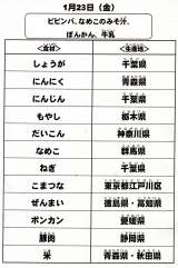 本日の給食で使用した主な食材の産地は以下の通りです。