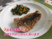 🍠献立🍠 ごはん・サンマの蒲焼き・こまつなの磯あえ・秋の根菜汁・牛乳